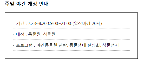 <li>- 프로그램 : 야간동물원 관람, 동물생태 설명회, 식물전시</li>