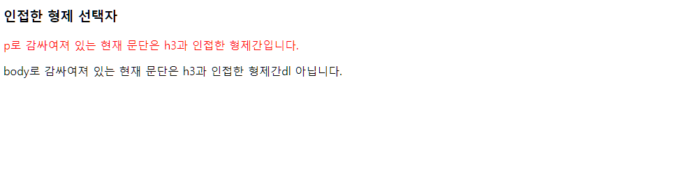 <p>p로 감싸여져 있는 현재 문단은 h3과 인접한 형제간입니다.</p>