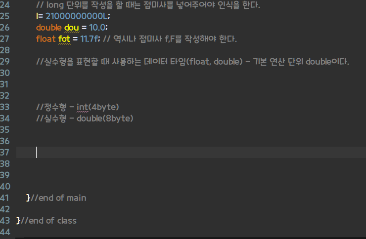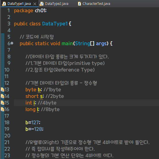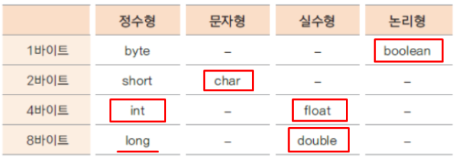 정수형 (byte, short, int, long) 1, 2, 4, 8