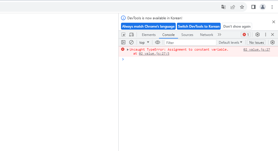 // hello = "안녕"; // 값 수정(변수는 가능)