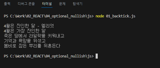 // ``(백틱) : 키보드 왼쪽 위에 1 숫자 옆에 자판(홑따옴표 아님)